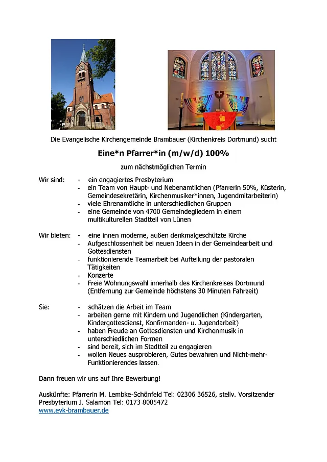 Bewerbungen bis 31.12.2025 an das Presbyterium der Ev. Kirchengemeinde Brambauer über die Superintendentur des Evangelischen Kirchenkreis Dortmund
