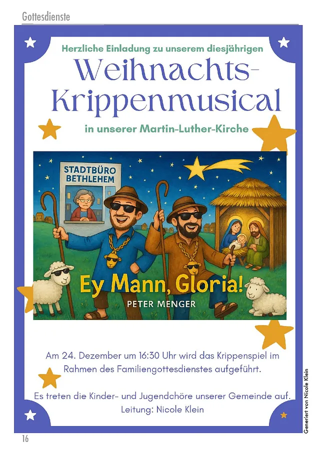 Am 24. Dezember 2025 um 16:30 Uhr wird das Krippenspiel im Rahmen des Familiengottesdienstes aufgeführt.