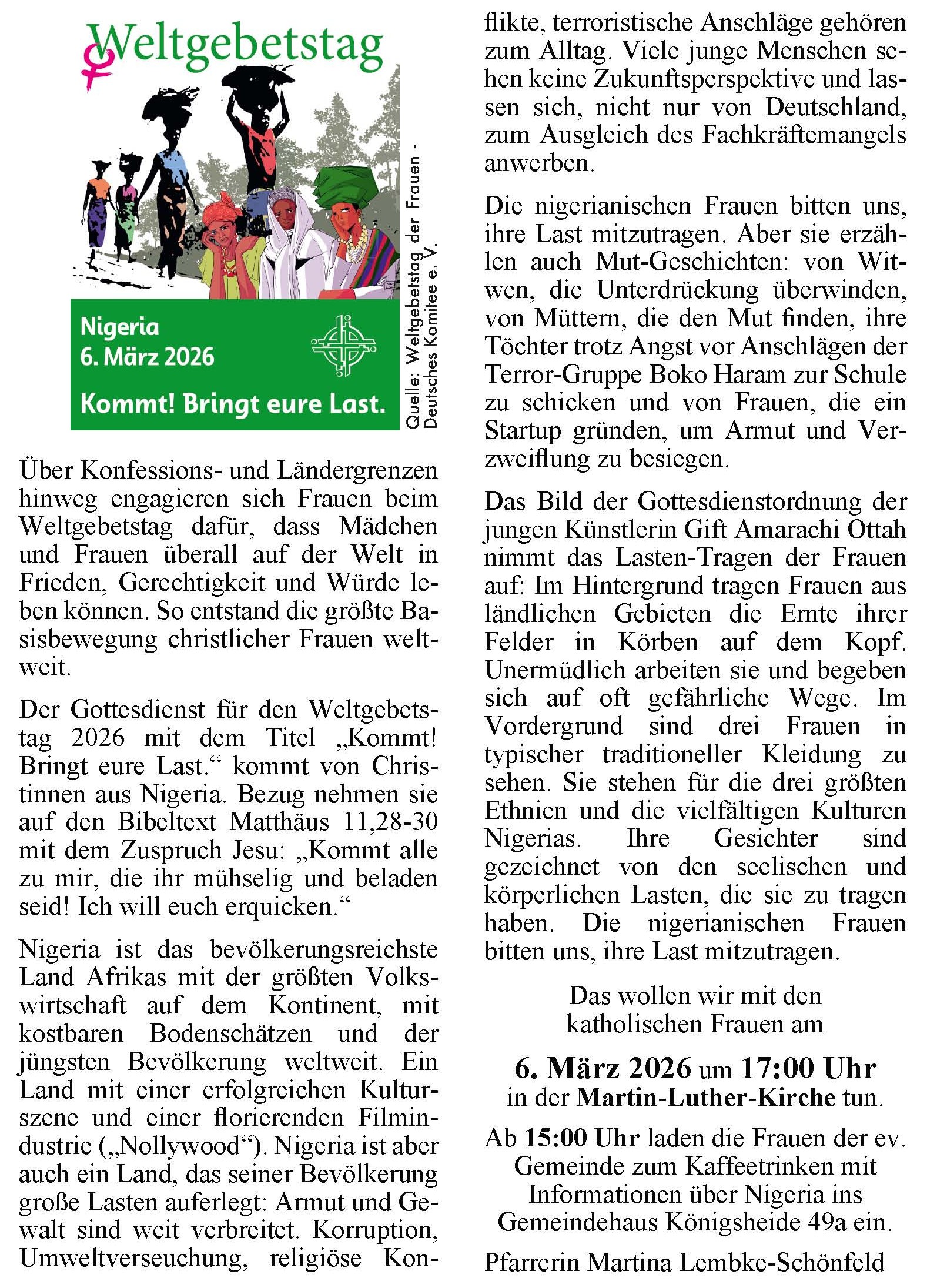 Der Gottesdienst für den Weltgebetstag 2026 mit dem Titel „Kommt! Bringt eure Last.“ kommt von Christinnen aus Nigeria. Bezug nehmen sie auf den Bibeltext Matthäus 11, 28-30 mit dem Zuspruch Jesu: „Kommt alle zu mir, die ihr mühselig und beladen seid! Ich will euch erquicken.“